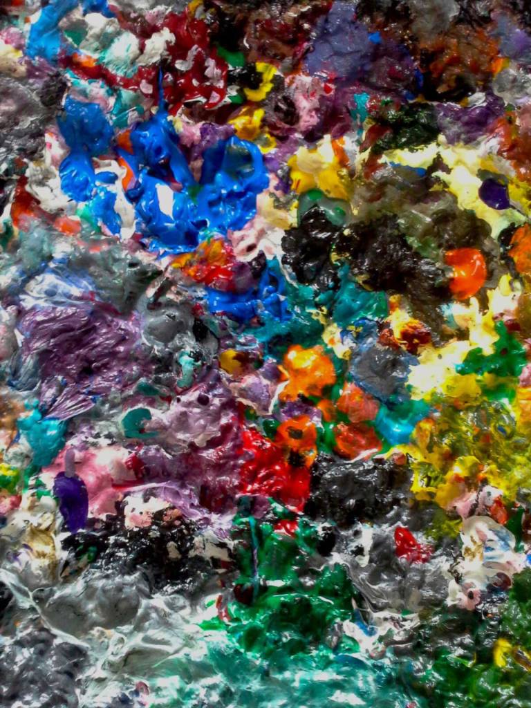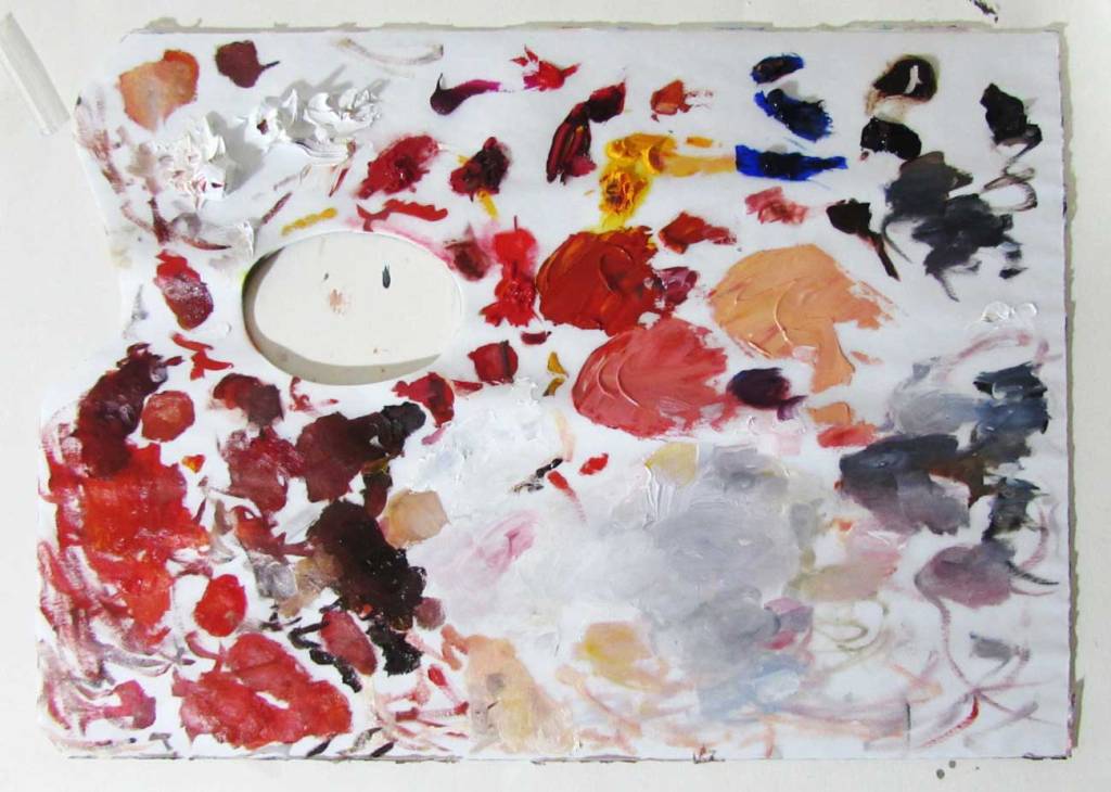 44 – 45: EMMA O’SHAUGHNESSY – “The photos are of my palette, which have built up layers upon layers of acrylic paint over the last 4 years”. “Emma O Shaughnessy works mainly with acrylic, creating figurative and still life paintings. She is best known for her self portraits that explore themes of self-awareness and concealed yet consuming emotion. Emma is currently based is West Cork, Ireland.”