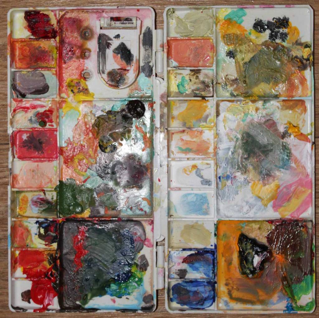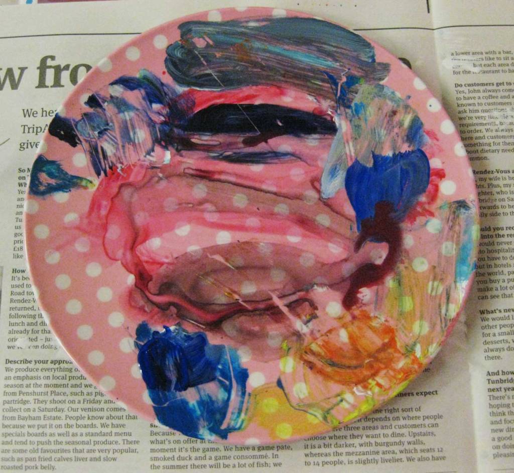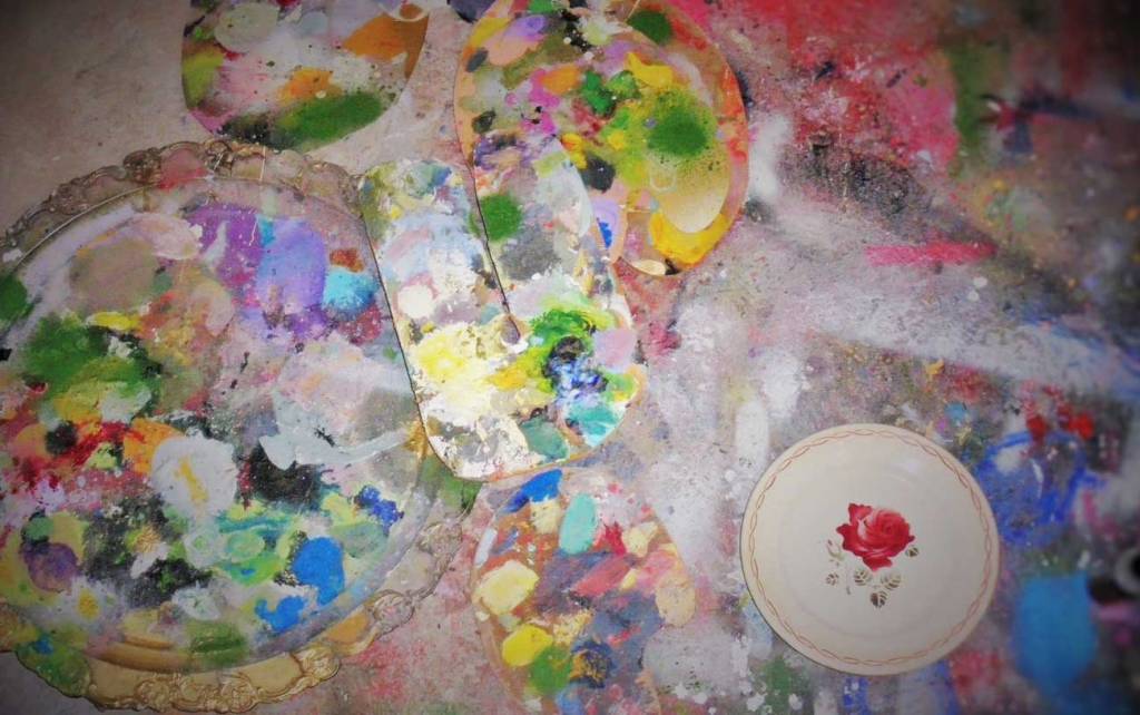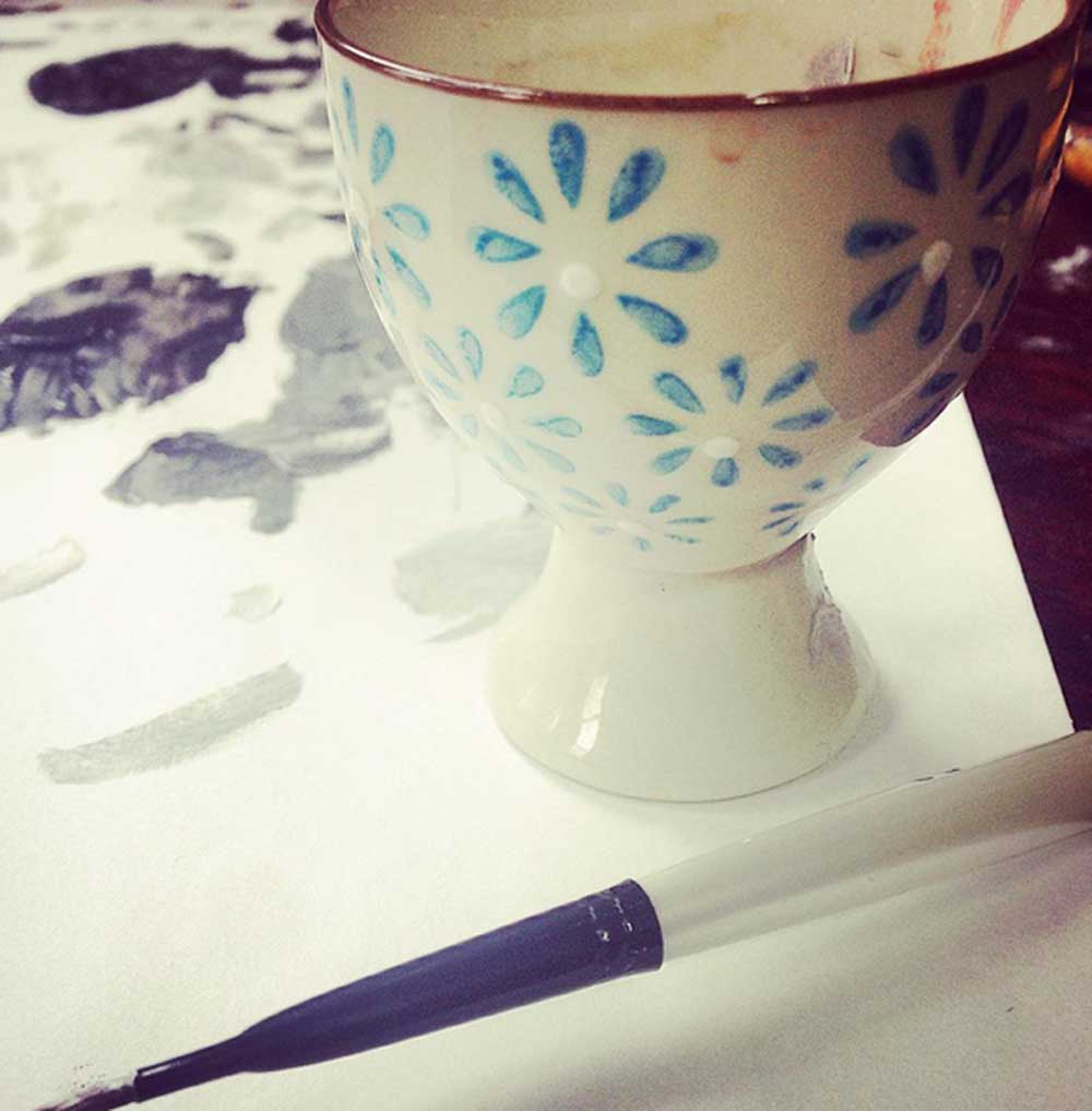 167: STEPHANIE DOUET – “I live and work in the Norfolk countryside, making installations and paintings about the British in India in the 19th century. Using painted photos, wall-drawings, collage and painting, I’m working on a series of over-painted photos, besotted by the beauty of the images but always uneasy at my place in relation to these dead people. I produce imaginative portraits that echoes the sepia and hand-tinted tones of early photography. The object featured in the photograph here is a china palette I’m part way through cleaning. I like its flower shape and the fact that it is a really well-made, useful simple object. It is sitting on a piece of board that I’m sanding and over-painting for what seems like the hundredth time”.