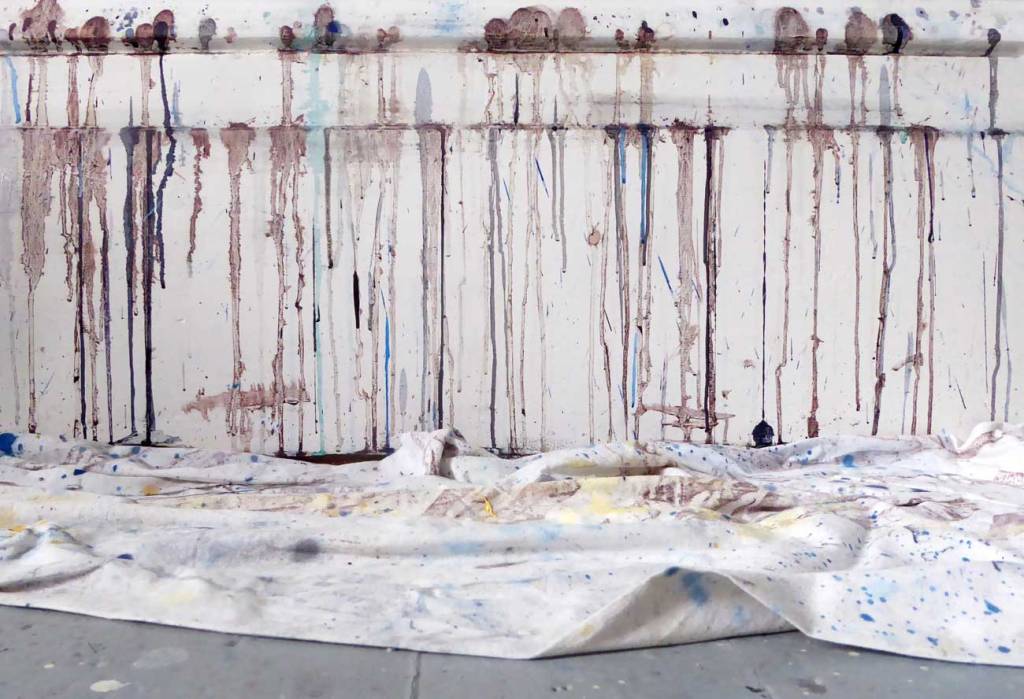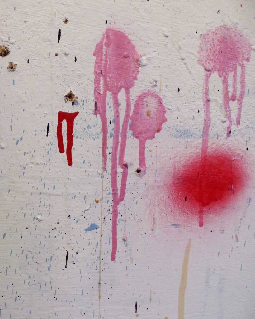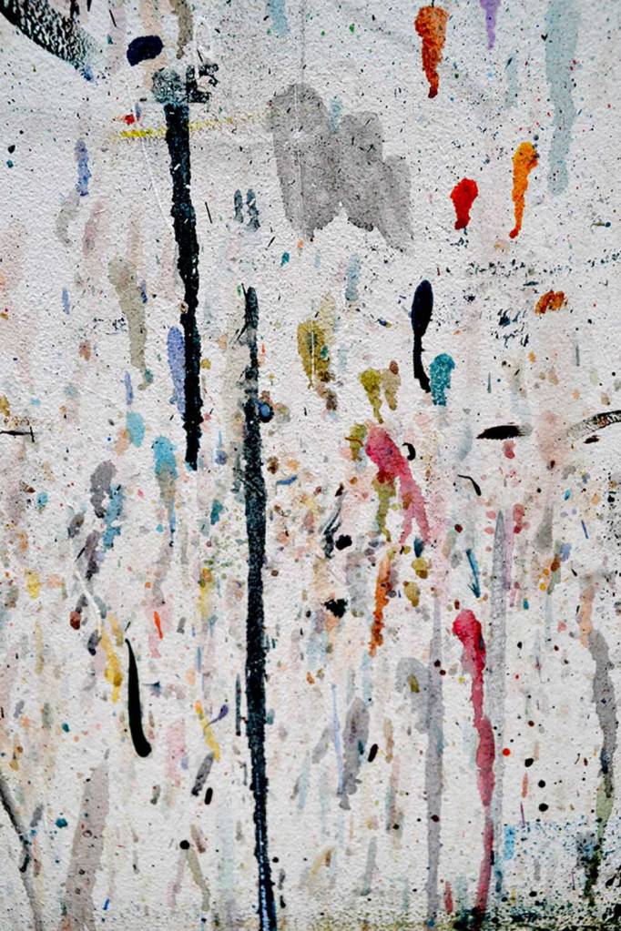 225 – 226: PEGGY COZZI – “My process incorporates the improvisational and accidental , the images here are incidental “painting” marks left on the studio wall after I had been working on a piece , applying paint through a syringe”.