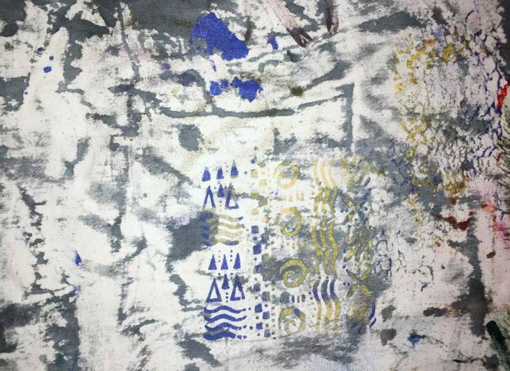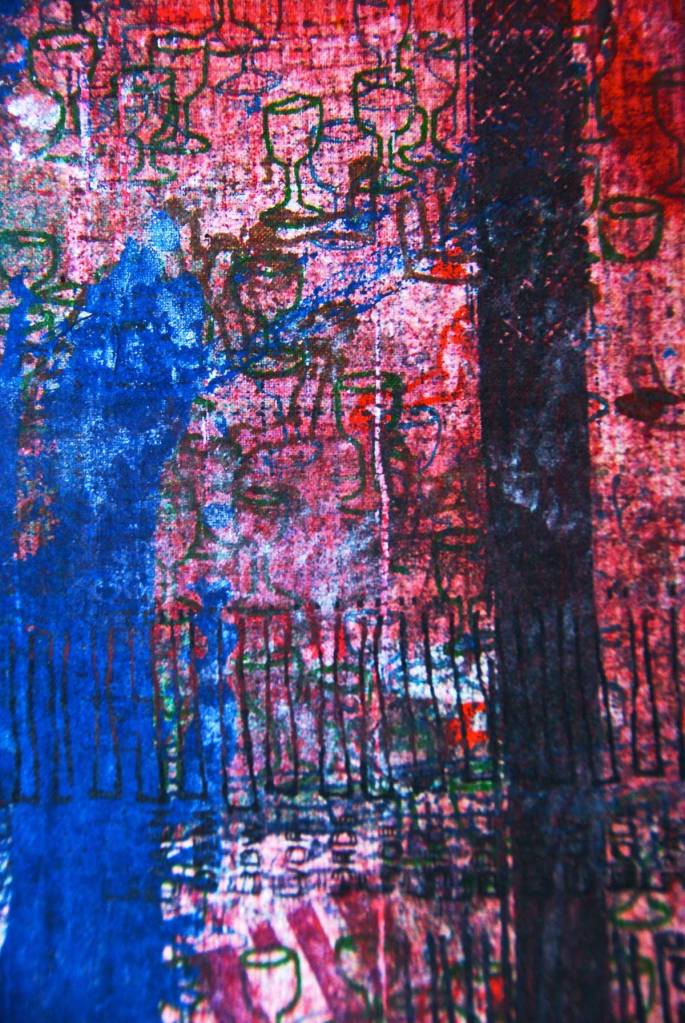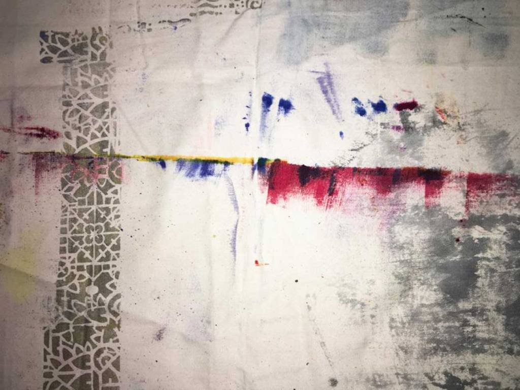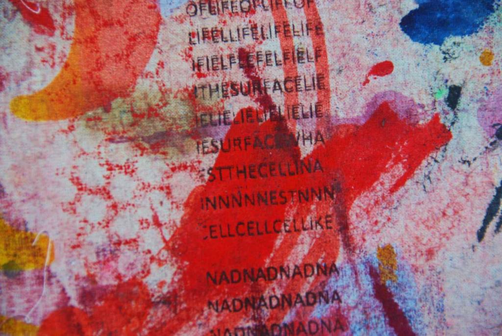81 – 82: JOANNA O’NEILL – “I am an artist working predominantly with textiles. I use a range of media including acrylics, oil sticks and dyes directly onto cloth and paper before adding stitch. These images are taken from the cotton cloth I use to protect my work table, and include run-over of rollering, screenprinting, stencilling and block printing as well as removing excess paint from brushes”.