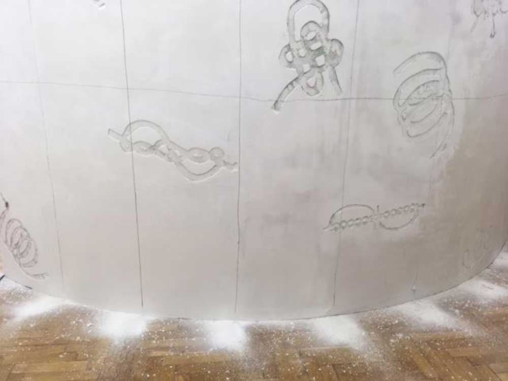 19: DIANA BURCH – “The ‘Mind over Matter’ Residency explored a range of materials as a broad interpretation of drawing and how they could be manipulated continuously from 2 to 3 dimensions. PVA forms were used as moving stencils to create images with acrylic spray paint. The cellophane protection I used recorded the layering and removing the forms in an intriguing narrative of processes, revealing more about my own presence than the work itself. The transparent plastic also reflected light and created shadows under the spotlights, suggesting a 3 dimensional form. I showed the two pieces in tandem as “Works On and Off Paper’”.
