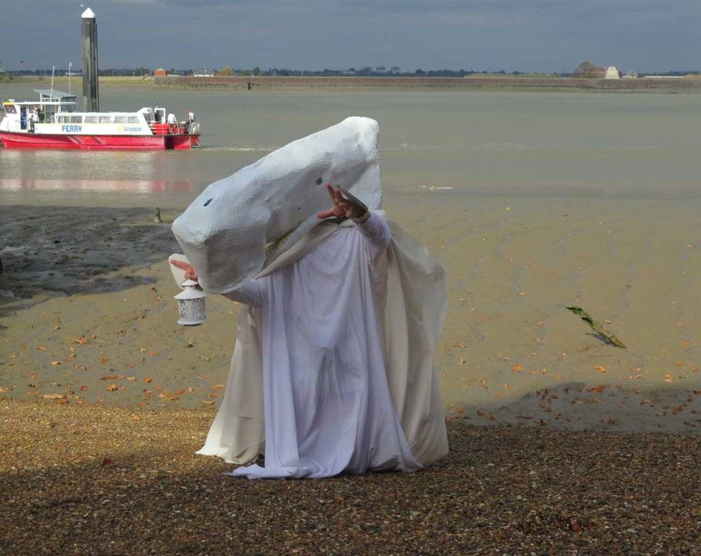 114 – 119: CALUM F. KERR – “The photos detail marks that were made during the conducting of the performance ‘Cachalot Beckoning (Thames Mouth)’ for the Inspiral London/Kent Festival on 14th October 2017. For three hours the ghostly white whale returned to Gravesend after nearly 300 years, for on 30 August 1718, a forty foot whale was caught just below the town causing ‘much excitement’. In 2017 the Whale communicated with townsfolk using clicking echolocation, the marks were picked up along the promenade, on the beach at Bawley Bay, skirting the River Thames. Calum F. Kerr is an artist whose work often involves performance, sculpture and sound. His artwork relates to place through inhabiting characters such as J. D. Swann (ornithological investigator), Brian Guest (founder of the Society for the Preservation of Admirable Rubble), and a White Sperm Whale. He has exhibited and performed at numerous exhibitions in the UK and in Bulgaria, France, Germany, The Netherlands, Portugal, Spain and the USA. In 2016/17 he received an Arts Council England International Development award for research and travel to Japan for his project ‘Calum’s Road to Aonodomon’”  – Film of a previous appearance of the White Whale