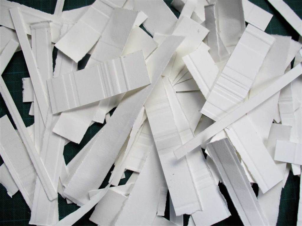 123 – 126: A ROSEMARY WATSON – “My practice includes drawing painting printmaking photography artists books and video encompassing chance intuition and spontaneity and is concerned with notions of memory exploring my personal response to and forming a record of the constantly shifting and multi-layered nature of memory which blend and blur over time into a personalised version of history Image 1 – a pile of 300 g white satin Somerset paper strips trimmed from blind embossed prints. Images 2/ 3 / 4 – the remains of the process of etching zinc plates in a copper sulphate solution, washing and finally stripping them in soda crystals (now dried out)”.
