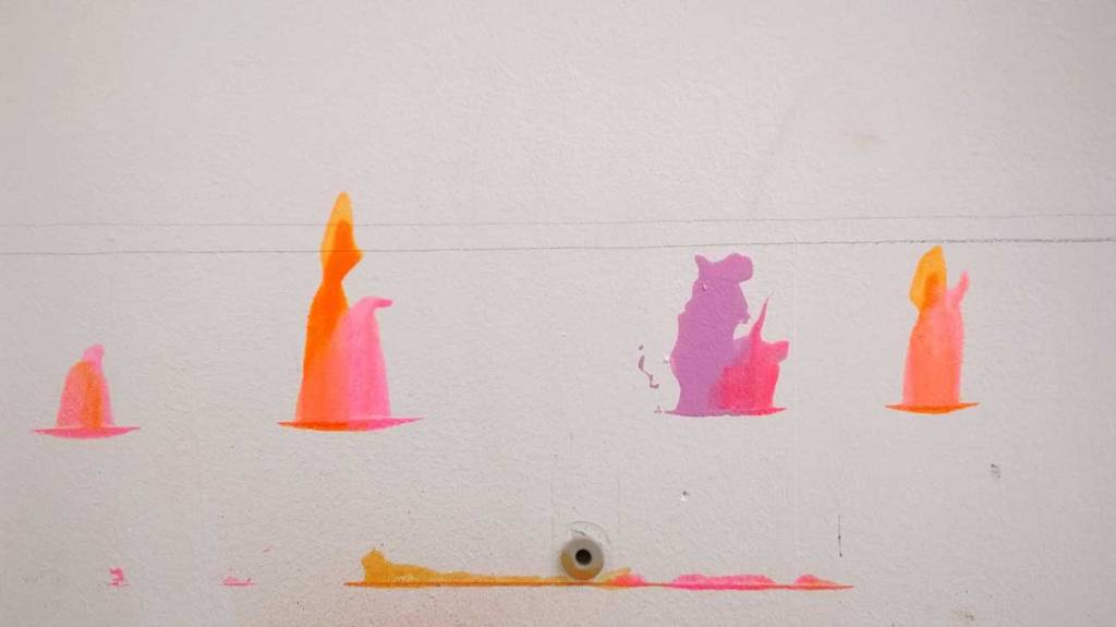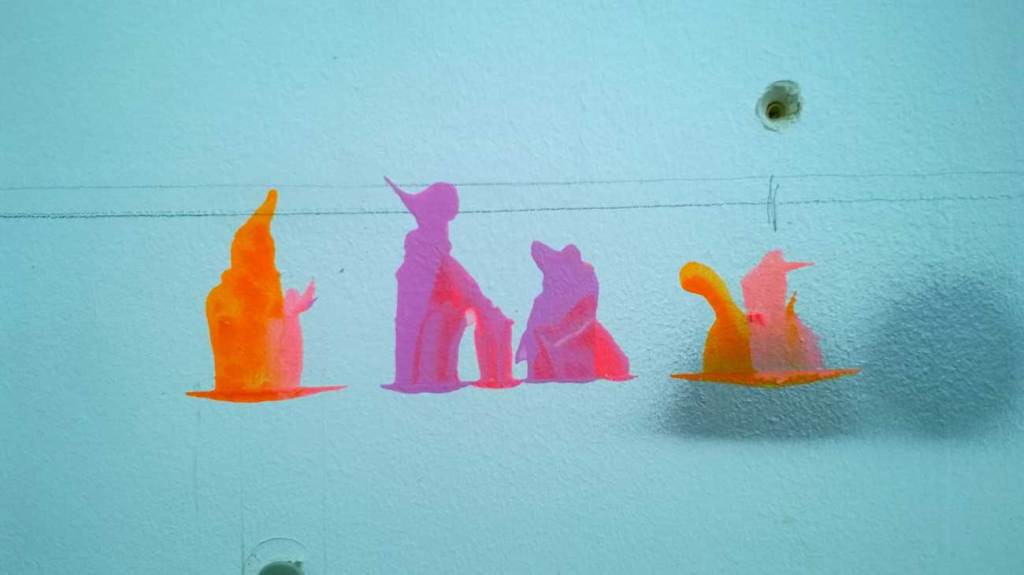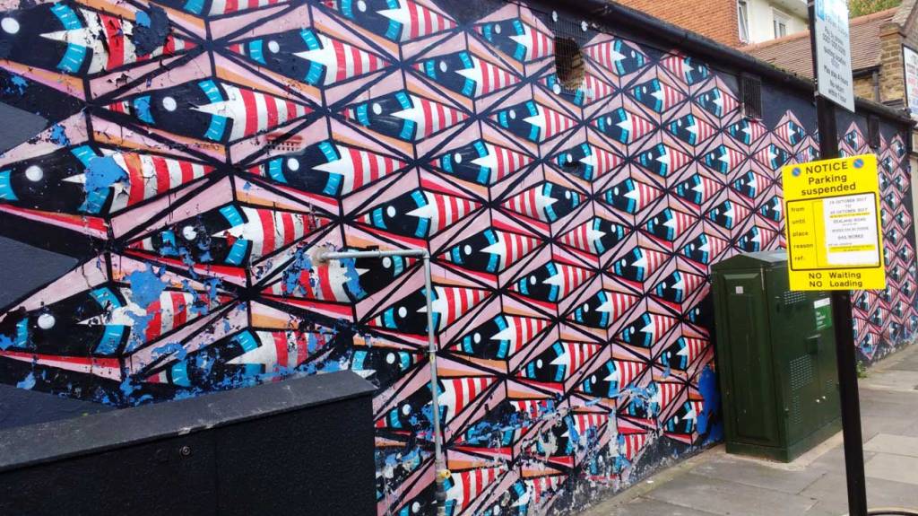 62 – 64: HELLO THE MUSHROOM – “Hello the Mushroom is a London-based artist whose work can be found in many forms on the streets and in galleries. Her work is mostly based on collage and reworked found imagery. It takes a humorous approach to female sexuality, body image and beauty standards as well as reflecting her recovery from a life-threatening form of cancer. Her work often features skulls representing the transience of life while challenging us to re-evaluate our life’s purpose and priorities”. “These are photos of the markings made during the execution of a recent mural. My instagram account (where you can find a wide variety of my work) is here.