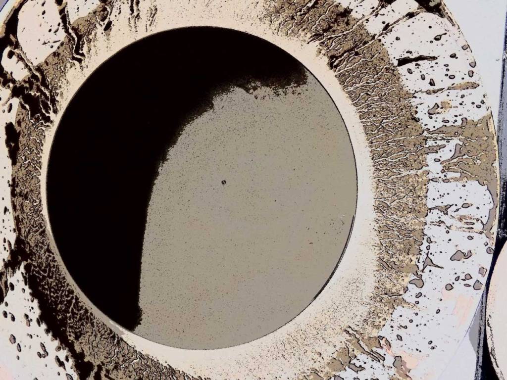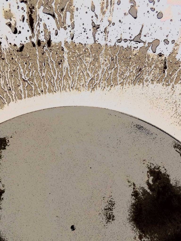 220 – 224: PAT SOUTHWOOD – “You are looking at the bottom of a bucket of glaze. The orange light is my Halogen heater, shining through the bottom of the bucket after I had cleaned it out. The glaze the bucket contained is made from reclaimed silt from the Norfolk Broads”