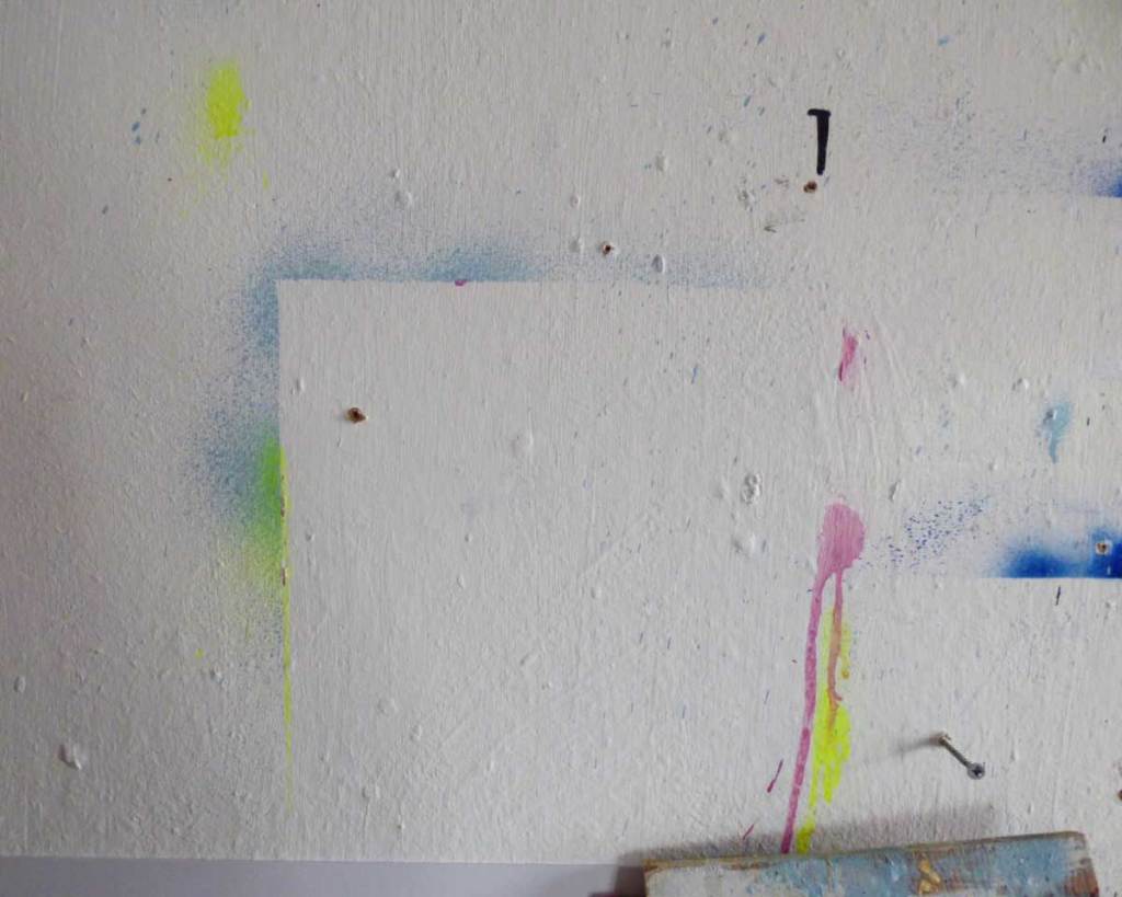 241 – 244: SALLY JONES – “Sal Jones lives and works in London producing contemporary figurative oil paintings, with an emphasis on emotional conflict and expression. These are photos of the studio partition wall that I hang canvases on whilst working on them . The marks are oil paint residue from the activity of painting. You can make out some of the different sizes of canvas I have worked on by the negative spaces left. On one you can see the level on the wall where the painting palette (an old cupboard door) rests up against the wall”.