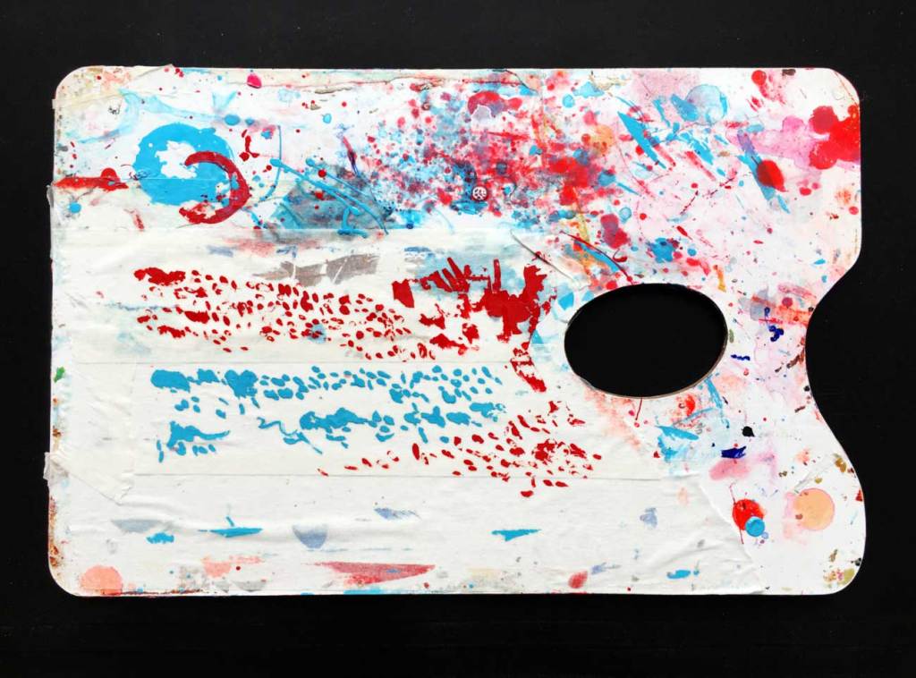 235: QUIET BRITISH ACCENT – Quiet British Accent (QbA) are an art duo, Sharon and Jason Gale. Working together since 2011 they use a variety of sign-writing and sewing techniques to explore their love of lettering, language and pop culture. Quiet British Accent are known for their #pennydrops – fake expansions of their QbA acronym, hand painted on pre-decimal pennies, left on the street for people to find.This is QbA’s main paint palette, splattered with their favourite red and blue enamel sign writing paint”.