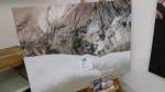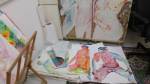 Persian painter Esfandiar Ahmad seems almost apologetic about his ten minute paintings of people, paintings that celebrate so much in terms of both the energy and colour of paint and water, the combination of the two, as well as the poetry of the body – he’s a celebrated poet as well apparently and he says that these pieces aren’t typical and he’d rather us see his more abstract work that he doesn’t have in his rather calm studio right now. Carpets and eastern music, uncluttered floors, chairs and cushions, an oasis of calm in here, but those water colours are rather delicious, the controlled “accidents” as he lets the very wet paint flow – they kind of need to be up on a big white wall – not in frames though, we need the raw energy of that buckled paper, the beautiful edges – we do need to see all these on a gallery wall (do wish more would happen in that big Space Gallery space just around the corner from here on Mare Street, my own studio is directly over the street from Space Gallery, been to one or two rather good shows in there in recent yeats but nowhere near enough, the place seems annoying closed and unused most of the time and when it is used it can so often be in such an annoying way, why aren’t some of these artists ever in there? Space gallery can be a frustrating place). Esfandiar is another artist who tells us he doesn’t get to exhibit much these days, how he doesn’t know when he will again – love those water colours, so much life, so much energy, really need to see them up on a well-lit wall rather than in a pile on the floor, wonderful pieces, impossible to do them any kind of justice with a fractured photo snatched on a phone – wonderful colours, wonderful flow….