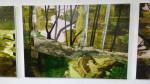 There’s some gorgeous treescapes painted by Zoe Benbow, she’s been working up in the Lake District so she says, she talks (via her website) of her “aim to communicate a sense of awe and enjoyment in landscape, as a means of questioning our cultural construct of wilderness and our relationship to the natural world”, she talks to us about her passion for paint, for landscape, for open space, her new work is alive with the colour of bark, the green of trees, of sap, of leaves, and she has some beautifully powerful paintings of mountains – Scottish mountains, mountains from Kazakhstan, she talks passionately of her trips there, beautiful paintings of mountains, earlier work almost hidden away until she’s encouraged to pull the paintings out (she’s got some beautiful accidental marks on her studio floor as well, we can’t resist asking her if she minds if photograph those marks).