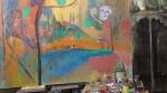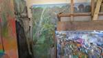 You can smell Jamie Boyd‘s intoxicating studio well before you find the doorway, a cave full of colour, full of abandoned almost empty tubes of paint, the perfume of oil and turps, and there beyond all the colour of the carpet and the (semi) chaos of the attention-grabbing pallette-come-table, several large works in progress, I love it in here! Jamie Boyd is an old school painter, a proper one, a real one, and once again, in all honesty a painter I had never heard of until today – well this isn’t the art of novelty and a quick shark-in-a-tank-spinning-wheel gimmick, this is the proper art of artistic doing, this is things observed, paint moved around canvas with passion, the real way of seeing, this is old school proper painting, it takes guts to do it this way rather than the Saatchi way. Jamie Boyd is busy preparing for a solo show at the moment but how does he get these large pieces out of here? There’s a glorious Australian landscape that he’ll surely never get out through his door? I want to start leafing through the stack of big canvases up against the wall, I want to look behind that one, “There’s more around that corner”he says as he points a pathway through paintings and around paint-encrusted tables, “I did have a bigger space in here but rents are going up” – his solo show opens on Saturday November 10th at Chappel Galleries, out in Chappel, somewhere in Essex. I love coming to these open days, so much to discover, art does excite, this is brilliant, so exciting, a privilage to be exploring in here…