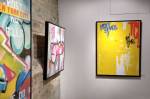 The art in the back room immediately hits – the rush, the Pink Panther delights, both artists have an impact but it really is about those clean-cut marks (not too clean cut) and those crisp layers (not too crisp) of Seen that hit straight way. The Risk pieces take a little more time to reveal themselves, the Seens make all the initial noise, the Risks let you take your time – teamwork, a perfectly balanced show, two artists talking to each other across the walls and that just right gallery floor, the dialogue is strong, the energy is impressive. And if someone was to say you can take just one painting home it really would be impossible to make a choice – a Pink Panther or one of those Soul pieces from Risk? Those Soul paintings really are beautifully subtle, those layers quietly invite you in, Risk plays with you, those layers play with you, they have you adjusting your angle to try and see behind – those warm Risk paintings demand you take time – the marks, the layers, the texture, the love of it, you can see the love, the pleasure that has gone into the making those marks. Unlike the Seen pieces, these Risk works are not about an instant hit, the beauty really is in the way they slowly invite your eye to roam, they way they pull you in, the invitation to mentally lift the layers and reach through the glass, through the paint, through the colour, They’re beautifully painterly actually, gorgeous, these Soul pieces hint at a painter who’s best work might still be yet to come, an artist who maybe be an old school legend from the last century but a painter who really is just starting, what comes next? These painting are alive with the possibilities, like he’s only just discovering, like paint and the possibilities of paint rather excite him here in 2017. It might have been the Seen pieces that provided the immediate hit but those Risk pieces in the back room really are something special. So which one to take? A Risk or a Seen? impossible to answer, I’d have to refuse the offer of just one and demand one of each please…