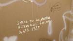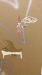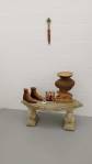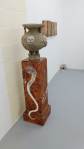 Will it be as powerful without all that polite Frieze art to bounce off? Will he still threaten to drag you off to the woods, hit you on the head, hide you in a bag (and yes, as you wonder around in the silence of that contemporary white-walled gallery with your white shoe covers on, those Liars do start quietly playing in your head again). What to make of Evgeny Antufiev? What to make of his snakes and his monsters, his clay pots and his words scrawled on his walls and why did we need to put on shoe covers to enter the exhibition anyway? He is without doubt an artist who excites, who’s head you do really want to get inside of, you really don’t know how much of his art is really from the forests or woods or from the Asian boarders of Russia, what kind of creature do they have there anyway? What is going on here? Really don’t want an answer to any of the questions, really don’t anyone to come along and attempt to explain him or that bowl of snakeskin or that dagger on the wall or what that piece is over there and how does that pot relate to that head? Really don’t want anyone to mess with his mystery, really really don’t want to know, and that mystery and that edge and that darkness is even more powerful in the silence and the peace and quiet here (really pleased I missed the opening and got to see it all in complete silence by myself, to see it without the noise and people and the wine and the art talk). Really really don’t want to know that much about who Evgeny Antufiev, I rather like my own interpretation of his various realities (not that any of my interpretations make any sense). Why are those pots over there? What has Michael Jackson got to do with anything? How do we read that one? What is he spinning? Why am I wearing covers on my shoes?
