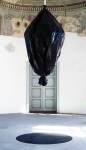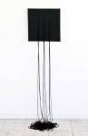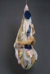 73: LOU BAKER – Nobody 1, 2014, leather, imitation leather, used clothing, hair, velvet, zips; stitch, print (190 x 70 x 70 cm, 5.5kg approx) – Nobody 1 is part of a series of three soft sculptures, Nobodies, hanging from meat hooks and chains, which explore ways that cloth and stitch can evoke the abject in art. The abject is the instinctive feeling of horror ‘to a threatened breakdown in meaning caused by the loss of the distinction between self and other’. Using a series of photo cut-outs from a photo montage book Lou Baker made her son for his 18th birthday, the idea of ‘body, no body, nobody’ was born. Each photo has a distinctive cut-out shape, framed with a memory of a place or time. Baker’s work examines her responses to her only child leaving home and explores ways to communicate the mixture of emotions involved in this transition, in terms of identity and purpose, loss and absence, through the visual language of abjection. What is left behind when someone leaves?