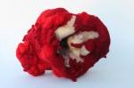 74 – 75: LOU BAKER – Part of me , 2017, felted hand knitted wool 21 x 20 x 20cm – Lou Baker makes public things that are normally private. Parts of me is a new series in progress of smaller, hand knitted soft sculptures. Hours of slow, meditative work culminate in a relatively short, unpredictable process of alchemy which dictates the outcome. Felting produces a disquieting change in control, transforming the familiar, comforting, recognisable knitted fabric into something ‘other’, body-like and strange. Here Part of me I is suspended with strands of red yarn in a locked glass cabinet in a hospital setting…..