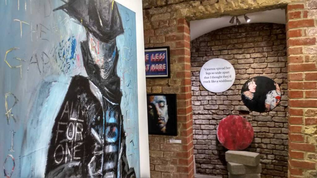 A gallery full of.contemporary painters jousting with the street art flavours and the pop art mass production, words flowing from Quiet British Accent alongside the frustration of Anna Choutova via that big white attention demanding white canvas and the positive word-engagement of Naomie Edmondson, an artist building herself a healthy reputation through her expansive outdoor wall-based engagement – “oh I’ve seen her work on the street, it always makes me smile when I pass her work” – I can’t say the piece she choose to bring to the gallery the gallery this times was her finest in terms of the choice of words, not sure about “farting around more”, do love those pieces on those street walls and canal banks though, love the positive life of it all, survival techniques you might say. And talking of words, The woven Jo Evans piece was rather thrilling in a quietly understated way, the pages of a book, is a touch of tactile textile excitement, a piece of art that figured in both parts of the Intent Show. The show here is Intent (part two), intent (part one) opened two days earlier on-line.