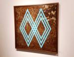 That Gary Stranger piece painted on the rusty textures at the Semi Skimmed show a couple of weeks ago was rather special, those flat clean sharp-edged icy-blue graphic lines on that dark rusted textured metallic background made for something rather impressive, one of his finest pieces. That piece had us wanting to see more of his gallery work tonight, we know Gary mostly for his bold graphic work out on the street, big pieces of clean-cut typography on the sides of buildings and such – that piece at the Semi Skimmed show.was a beautiful set of contrasts, that very sharp light blue line, the smooth typography on the textured metallic rusty weathered background, almost disappointing to see the same piece on show here again just a couple of weeks later though, we want more of the same rather than exactly the same. The piece is one of four pieces from Gary Stranger that are part of this group show tonight, the other three are impressive if ” tight execution” and sharp graphic lines are your thing, but that one piece, Lemniskate, is the stand out piece again tonight –