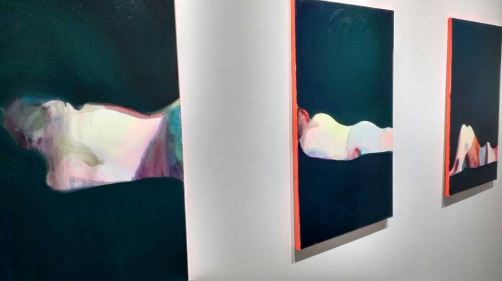 “Chris Moon is a self-taught British, contemporary artist with the unique ability to encompass a variety of techniques through vivid, emotional and at times, distinctly melancholic imagery. Expressed not only through images but the process in which he paints, his works often explore the painful,physical and emotional need for reinvention; resulting in his own mental state laid bare on the canvas. It is his combination of insight and integrity, as well as psychological and emotional force, to the genre of figurative and abstract art that has set him apart from other emerging artists to date. A single painting often receives due attention whilst revisiting and resampling works from the past and present. He has been known to near complete a painting before scraping it back to a single mark and starting again. His works are a journey without a definable end-point – an emotional dialogue if you will, between the self, the medium and the tool, to create new forms in a potentially infinite conceptual and physical process”. This is an excellent show (sw)