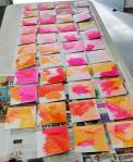 On Friday I had the space to myself. Gallery doors open, work up on walls, sun out, mess from the opening cleaned up, work table outside, I had planned to drag material in off the street to paint on – found a great door – but that didn’t feel right in terms of how the show had evolved. And so I took the opportunity to start work on a new 43 pieced piece, 43 small paintings all painted at the same time on 43 CD sized white cardboard envelopes, each one with a CD inside. 43 CDs each one containing an old promo or a demo or something or other that has been sent in at some point and was still hanging around here from the days when we has record label and Organ was a much bigger thing than it is now. 43 discs that were too interesting to just throw in the recycling, 43 discs that were unlikely ever to be dug out and listened to again if they stayed in a box here in the studio. The 43 pieces will be on sale at this year’s Art Car Boot Fair, you won’t get to choose the CD, just the art, just the painting, all about the 43 paintings that were started on the Friday on the table at unframed? The music inside will be there for you to explore, but this is very much a series of 43 paintings that were started at the Unframed? show and will be finished here in the next few days.