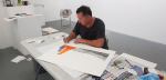 Six prints, each one a one-off piece, six pieces made and hung on what I imagine was a very “full-on” Tuesday. The work looked exciting when I walked in on the Wednesday, it looked like a real achievement, it would have looked good if they’d just been pieces produced by Hamish slowly in a studio over a few weeks (or months) before hand, particularly impressive that he pulled it all off in just one day in the space. A meeting of bright orange construction site hi-vis brutalism and natural monochrome, I really liked the pieces. Don’t ask me about the technique, print-makers care about these things, the rest of us are really only concerned with the results, the work looked powerful up there on the long white wall, six pieces, all very much part of a considered body of work, six pieces that worked as one whole, brutalist London concrete, the Trellick towers amongst others – the edges, the shapes. The work went down well with the architects who dropped in later in the week – no format gallery is in a railway arch surrounded by building sites and construction workers, we’re right underneath a tower that’s currently being build, the gentrification frontline, the entry to the new tower is in the next railway arch, the sales room is in the arch on the other side of the gallery, re-development all around – there’s construction workers everywhere. it took a couple of days to break the barriers down and get the workers to come in and have a look at what the two if us were doing, certainly an interesting place to spend a week