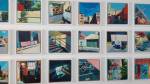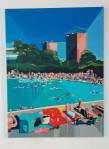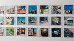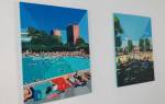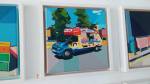 FRED COPPIN – Angles And Optimism – Rivington Street, Shoreditch, East London, August 2018 – Spied the show half way along Rivington Street, can’t pass an unexpected art show, don’t know much about Fred Coppin, well nothing actually, not heard of him, didn’t catch any of pre-show publicity (assuming there was some), apparently this is the last day of the South London based artist’s début solo show. Hang on, these look very recent, these look like very now, right now, these look like they were all painted during the current heatwave, the colour of that grass, the busy outdoor swimming pool (echoes of those Chris Moon London Fields paintings from a few weeks back), it rather looks like Fred Coppin has been very industrious. We’re told we’re right, they have all been painted this summer, painted in the last few weeks – this is good, this is refreshing, nothing revolutionary but then, as we’ve said before, it doesn’t always have to be, these are very satisfying paintings. Bright paintings, refreshing, exciting – “working primarily in oil paint, South London based artist Fred Coppin captures an eternal sense of optimism in his work through a distinctive combination of amplified colour and playful architectural forms. Whether the subject is a body or a building, Coppin saturates, dissects and exaggerates the real world into a permanently sunny, dream-like state”