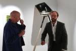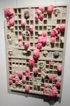The fact that singer Joe’s dad has a piece in this show kind of sums it all up, there they are standing together in front of the piece, father and son, proud, and you get the impression that the other artists here are long time friends that the band care about rather than just random artists they’ve found for a marketing idea and a record launch, this feel very honest, very real .So much of this show and this art and this band is about real, about people, about bonds, about trust and sharing together. This show is about family and a feeling of fierce love, a pride in the ordinary, a love for the place you’re in, in an uncompromising way, a celebration of uncles and aunties and the Polish people from the shop on the corner or that uncle Noel did once have a fight at the wedding and we all can laugh about it now, or that the car mechanics may have left this building but you can still feel them here with the bits of boyracer Ford or the stickers or the union Jack cushion on the chair they left behind. Actually where the art show starts and ends is a little blurred, I like that, I like that the art show and the life that was in here before it blur together and the “nibbles” in the bowls in the old office on the old yellow workbench are as much a part of the show as the big sculpture in the corner or the collage in the frame on the wall, I like that. I like this show, Idles are a band who care, they’re a band to really care about, they’re not just another band and this is not just another art show, this is an excellent art show, this is so so right, the thought of the joy of the act last night is making me smile this morning, that was a great opening, it isn’t a perfect show, but then it doesn’t need to be, loved it.. (sw)