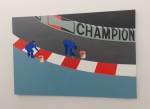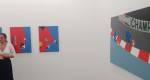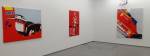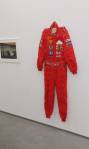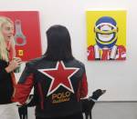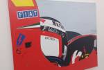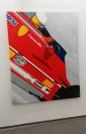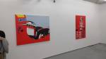 Quite a few shows to check out tonight, geography dictates the evening’s explorations start over on Sheep Lane by the Regent’s Canal, at the Fred Mann’s New Art Projects. The excellent basement gallery is by Broadway Market and not much more than a stone’s throw from the Organ bunker here in East London, the shows there don’t hit the spot every single time, they do more often than not though, New Art Projects has beem one of the more consistently exciting art spaces of East London over the last year or two There’s a return to the white-walled gallery for Zachari Logan tonight as well as a début solo show for painter Francis Wilks. The advance on-line tastes of the Francis Wilks show had promised something particularly intriguing, several side-swipes at the male dominated world of Formula One and the imagery of motor racing, at corporate sponsorship and James Hunt’s infamous breakfast of champions – “How To Sell Death to the Living” looks good as we drop down those stairs, swipes at a world dominated by large corporations, by consumerism and the “all pervasive materialism where men’s success is measured by the shine and speed of their cars” – mostly red and yellow images of 70’s and 80’s Ferraris, of Marlboro logos that become team colours rather than cigarette package logos, of Shell signs and prancing horses. The artist puts herself into those red cockpits and the logo-covered overalls (complete with those dare we say iconic James Hunt “Sex, Breakfast of Champions” patches from back there). It isn’t than women are actually banned from the sport but even the most knowledgeable of fans would be hard pushed to name that many female participants, off hand you tend to maybe think of Suzie Wolff and how she got as far as being a test driver for the Williams team in recent years before she declared the doors closed to her and gave up on the idea of actually competing, and then maybe, if you can remember that far back, Divina Galica, the only female driver who actually managed to get to race in Formula One back in there the 70’s for a brief period. Bold bright paintings, graphic paintings, pop art imagery, the paintings are, according to Frances, of “racing cars in capitalist colours, images that that question the speed of life”. You could read her conversations in her paintings in several ways, is it a feminist kick at it all, or is she a fan? Maybe she’s both? Does she want to be part of that world or is she making fun of it? I suspect I know the answer, rather like not quite knowing for sure though, what is she saying with those impressive yellow, reds and white paintings? With the corporate colours and her name painted on the side of the cars where the names of those male racing drivers should be rather than a girl’s name? A world where women aren’t that welcome unless they want to stand on the grid decorating things..Rather like this show, rather like her style, rather like her conversations, want to ask her a million questions, then again I don;t want to ask her any, great show, powerful show…
