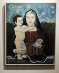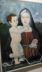 We’re heading for Nelly Duff’s place, Shipton Street Gallery first though, Shipton Street Gallery is pretty much on Columbia Road, there’s a painter called Grace Morgan Pardo opening a show called “Queen of Knots” tonight. it isn’t the biggest of galleries so we’re hard pushed to get a decent look at what’s on the walls, it looks rather intriguing though, it looks like there’s something of substance here, something rather impressive. Rather like these paintings, rather like her “traditional” style, her symbolism, her pastoral warmth, her hints of feminine power, of fertility, The paintings are semi-religious in feel, alive with symbolism and a language almost lost to days long gone, the middle ages, kings and queens, trees heavy with fruit, different languages playing together., the Virgin Mary, the snake, historical, catholic interplay maybe, references to paintings from a long long time ago. Hard to really see the show with all the people in the small gallery for the opening tonight, really like this show though, really really like the layers that are waiting to be peeled back in those delicious paintings, something rather different for this 21st Century. There’s something very personal here, something maybe a little deeper, something that needs to be explored properly on a less crowded day – and paintings all rather beautifully painted, all rather alive with so much, lots to explore here, need to see these paintings again, they’re rather exciting. need a better look