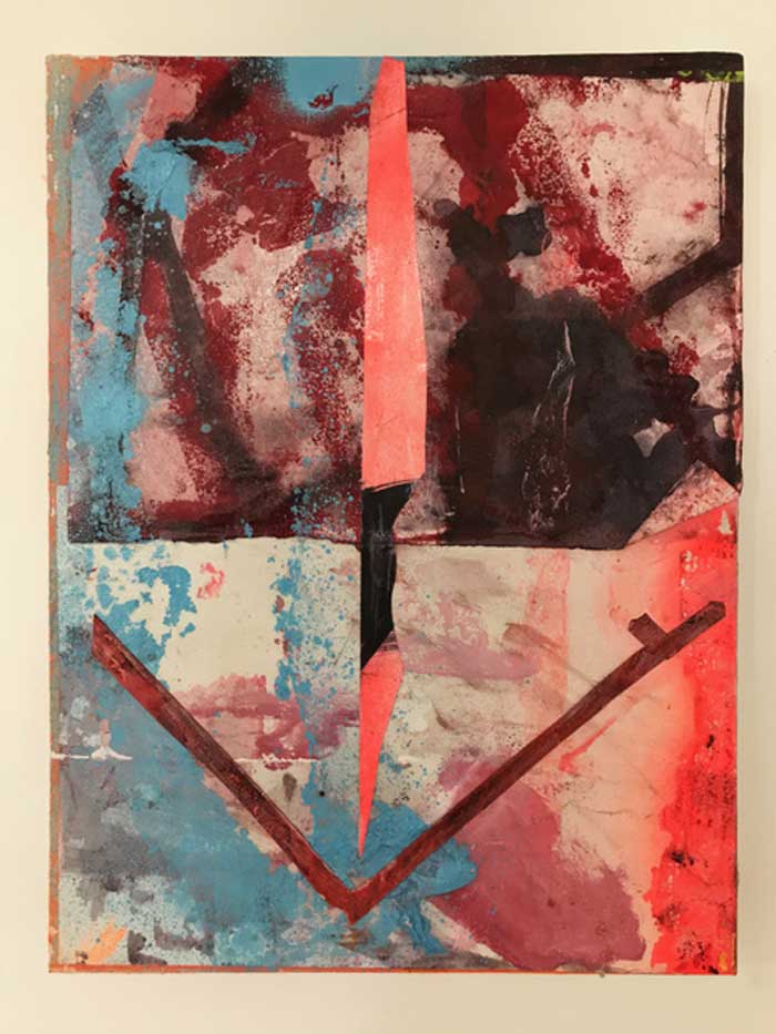 19: STEPHEN BUCKERIDGE – On The Iris of the First Comers Eye (2018) – Acrylic, ink, spray paint and pasted paper mounted on panel, 40x30cm