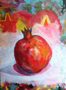 25: SEAN WORRALL – “The Hackney Pomegranate (No.1) February 2019. Acrylic on found wooden board, 21cm x 15cm
