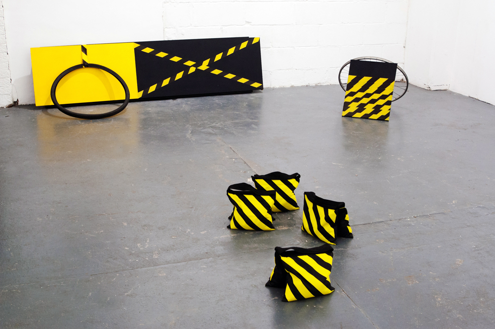 68: KATARINA BALUNOVA – F*ck Tape Composition, 2018 – installation, material: canvases, tape, wheel, tyres
