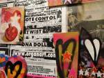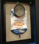 it was packed on out side of the street, wasn’t much time to get over to Nelly Duff where the My Dog Sighs opening was happening upstairs above what I guess you would call an urban art shop mostly full of slick prints in slick frames and such, My Dog Sighs had an small solo show, something called Crylong, apparently a reference to old school spray paint, Krylon, and the original excitement of that Martha Cooper book back in the day (come on, none of us could get our hands on that Krylon stuff back in the day, it was all about Halford’s and getting past the guy on the till who wanted to know why you needed so many colours just to respray your dad’s car). I have to confess here, My Dog has got a little slick for my tastes these days – no doubt the guy can seriously paint, and if you like your street art slick then My Dog is up there with the slickest, and those faces do still have individual character, you still can’t help but pick out your favourite as they catch your eye and almost wink at you,, and it is good to see him doing so well, but it is all a little too safe for me these days. That rust show back there was so alive with risk-taking texture, there were canvas pieces up on the wall back there that people petty much ignored in the scramble for frames cans, there were pieces up on that wall in Vyner Street that really did excite. This time around we’re talking slick prints, graphic colour And perfectly executed hand-painted cans, and yes Mr Dog deserves all the admiration he rightly gets but I need a few more risks, I need him to take off his safety belt and take a risk or two, make a few more off-kilter moves, throw a little curveball or two and not be afraid to miss once in a while/ I want more rust, more texture, more danger, more flaws, more mistakes – and this is something that hits me again and again with so-called urban artists at the moment, the Moniker/upfest mentality, everything is way way too slick, way too safe, way too obvious, way too well behaved – get the limited edition print out there, get the coffee table book out, don’t challenge yourself or anyone else too much, keep it neat now, be “the bomb” and let them tell you you’re “smashing it”. Hey look, I like My Dog, I like the person, I like the art, I love that so many people love what he does, I love that his night was busy, that his show was full, that people were lining up before it opened yet again but, like most of what I see the street artists doing now, it is all just a little too polite and rule-obeying – go on, I love you to bits, but break your own rules and get out of your comfort zone just a little bit, go on, cut your finger on a bit of rust, take a risk! We did go back for another look on the Friday without all the crowds and the distraction of meeting of people and the having to rush back to our side of the street, do like the glint in the eyes of some of those faces on some of those old cans, good on My Dog, excellent, but there were four or five paintings on canvas in that original Cultivate In Rust We Trust show back there that he’s never really quite touched on again and I do so wish he would. Hey look, I fully admit I don’t get the limited edition print culture, I like my paint to be alive, I like my art flawed rather than “perfect”, i don;t like perfect frames, “slick” is not a word I get on with, good on the Dog though, really pleased to see him doing so well. Great show, great night, great vibe in the street, good when things happen in more than one space, when it all comes together like it did last Thursday, not that Nelly was that bothered – did she even notice? We need more coordination, we need more galleries and curators and artists coming together and making things happen at the same time, it isn’t a competition, audiences need to be considered, lots of people came out on Thursday because they were getting two shows rather than just one, The East London art scene is way way too disjointed these days, last Thursday felt a little like it was five or six years back, it almost accidentally came together back then, it needs a little more effort, a bit more talking and a bit unity to make it happen like that now, we got a taste of it last Thursday over on Columbia Road…