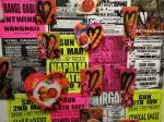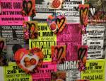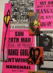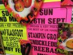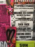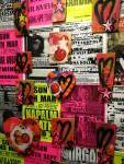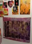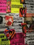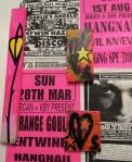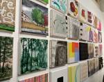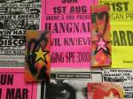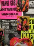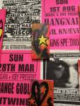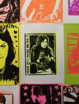 A two person show yes, but a show that really was all about Emma Harvey and her big wall of Joans – there wasn’t a print release, none of them were on sale, it was one piece of art, 96 very (very) bright handmade punk rock lino prints alive with dayglo attitude, what would Joan Jett do? No one’s permission was needed, no one’s reputation was cared for. Sure, there were two artists sharing the space, I was the other one, but it really was all about that head-to-foot wall of glorious Joan Jett riot-grrrl-fuelled dayglo intensity. The wall looked brilliant, it was exciting, people reacted, “Oh I loved Joan Jett”, “who is Joan Jett?”, “we must go home and ask Alexa to play some Joan Jett”, the council Roadsweeper went past singing “I Love Rock ‘n Roll” very loudly, people came down to have their photos taken in front of it all, I knew it was going to be dayglo-bright, the photos go nowhere near capturing how bright it actually was, 96 Joan Jetts on the wall and a couple of Joan Jett tapestry pieces as well, I loved it, they loved it, I’m pretty surer Joan would love it, Yes, it started off as a two person show but it really was all about Emma (and Joan) this time/ I kind of knew what she was going to do so I reacted with some old gig posters from my days when I was silly enough to put gigs on as well as run a record label and sit in the back of transit vans touring the land and such,, old dayglo gig posters full of ancient history, that and one last Organ t-shirt left from the end of the last century – there’s been a whole roll of old gig posters up on a shelf in the corner of the studio for years, forgotten about half of those gigs – oh and an old piece of art from way way back, an old textile piece, a resist print from a screen print and a leafy line-drawing (no it wasn’t Batik!) See, it was always about leaves (check some of those old record sleeves, they’ve all got leaves Growing on them). Anyway, a two day show, a whole load of old Organ history dusted off for one last time and a whole load of recent paintings on found recycled pieces of wood picked up off the street or out of skips all hung in response to the wall of punk rock on Emma’s side of the gallery. It really was all about that wall of Joans though, that wall looked brilliant and I don’t care what you think about me saying so (sw)