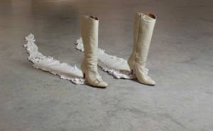 186: ROSEMARY JANE CRONIN – ‘Ursula Walking Off Set’, Clay and 1960s Boots. Exhibited at ‘Won’t You Please’, Solo Show at Gerald Moore Gallery