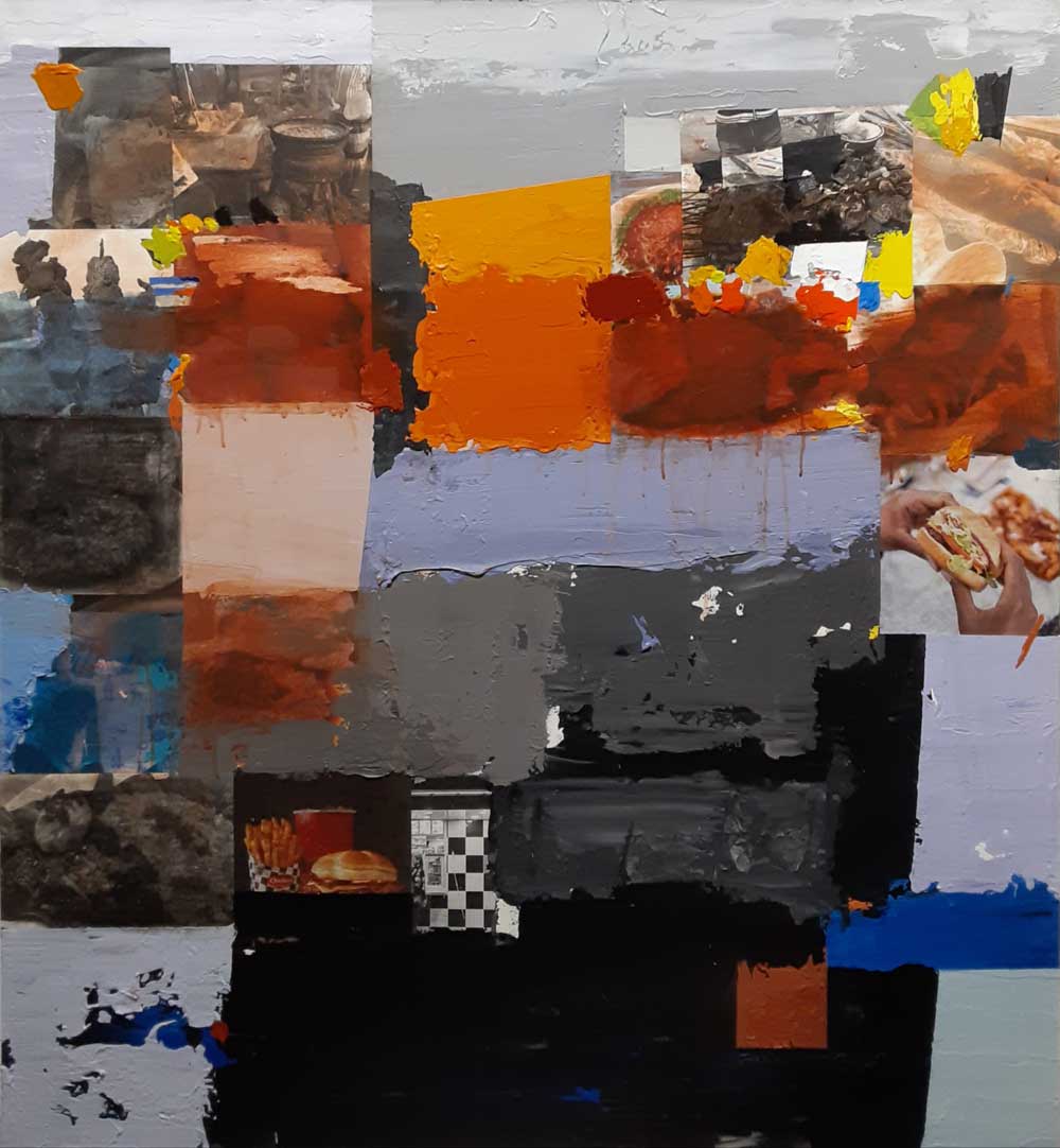 245: MONSUR AWOTUNDE – “While it’s hot 1” (2018), Collage and Acrylic on Canvas, 48×44 inches