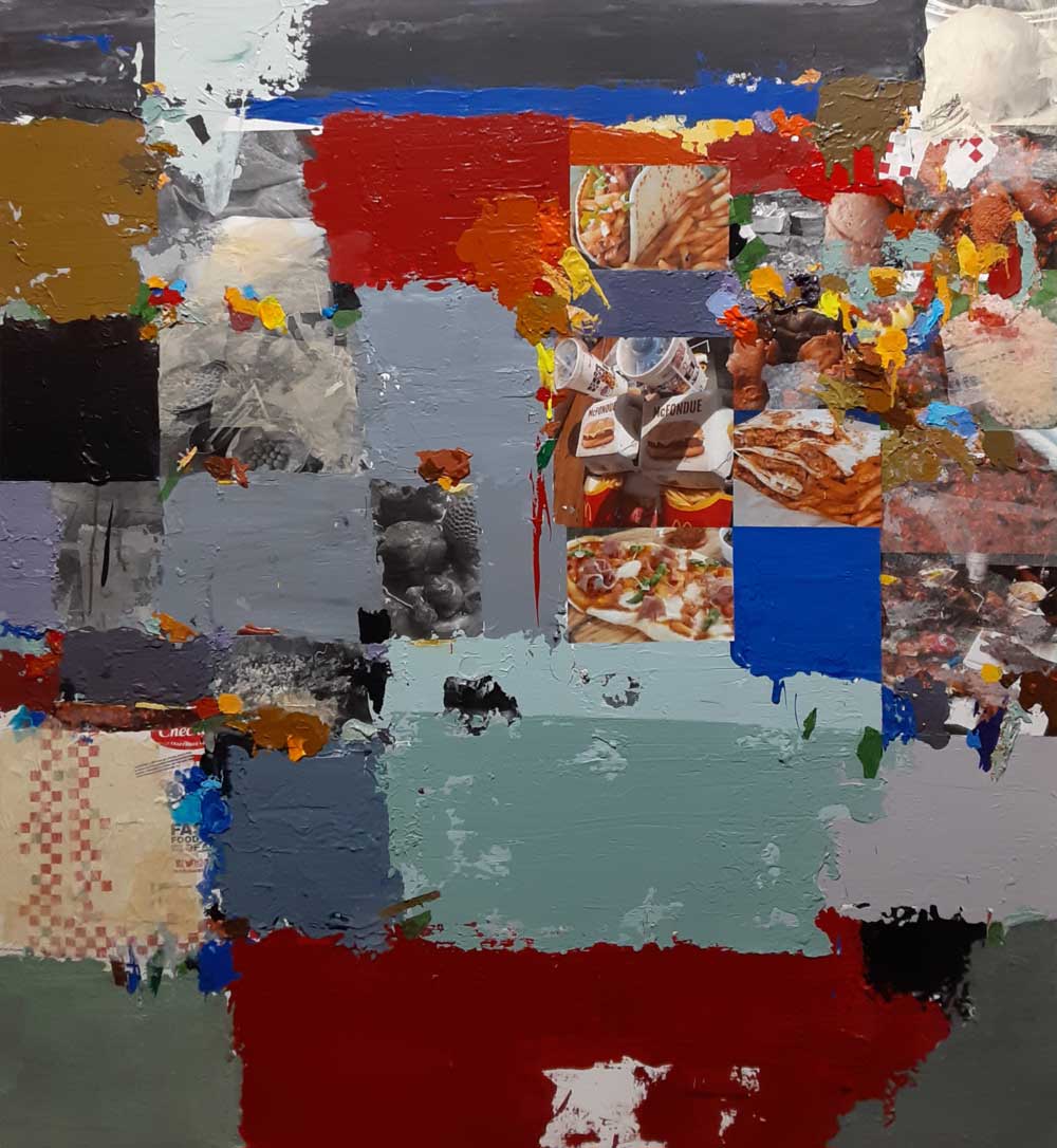 249: MONSUR AWOTUNDE – “While it’s hot 2” (2018), Collage and Acrylic on Canvas, 48×44 inches