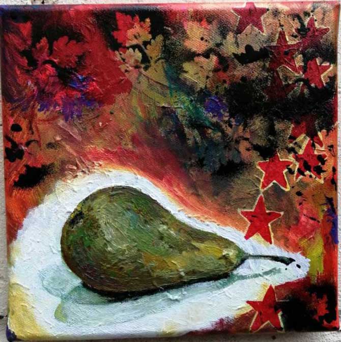 50a: SEAN WORRALL – “A Pear From Broadway Market (No. 2)” Feb 2020 – Acrylic on canvas, 20cm x 20cm