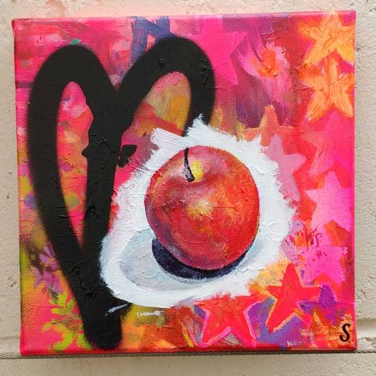 51: SEAN WORRALL – “An East London Apple No3” (May 2019) – The ongoing exploration of fruit, still life paintings. Acrylic on canvas, 20cm x 20cm.