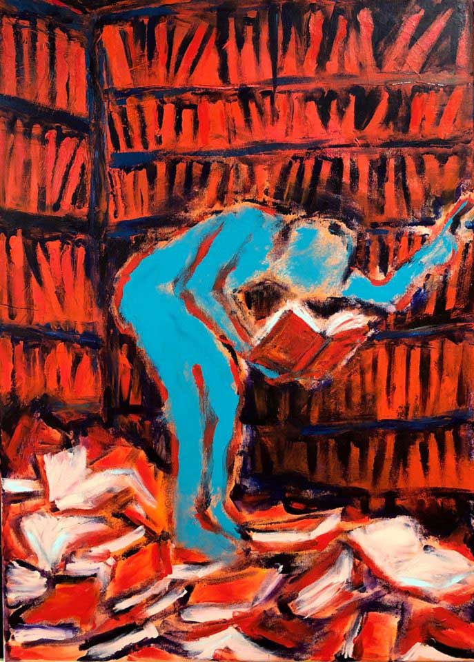 66: JAMES JOHNSTON – ‘The Reading Room’. Acrylic on 70cm x 50cm canvas.