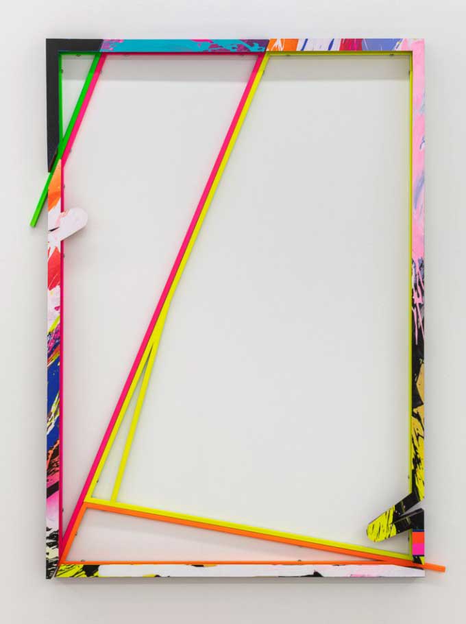 97: MÁRTON NEMES – F.O.M.O. (Fear of Missing Out) 01, 2019, Acrylic on silk-screened paper, mirror board, light reflective vinyl, PVC foam board, car paint, and steel frame made by the artist, 134 x 94cm