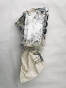 104: HANNAH ANDREWS – Egg Box (2019) Plastic packaging, calico, acrylic paint, newspaper, duct tape, masking tape, wooden board, duvet extract, staples