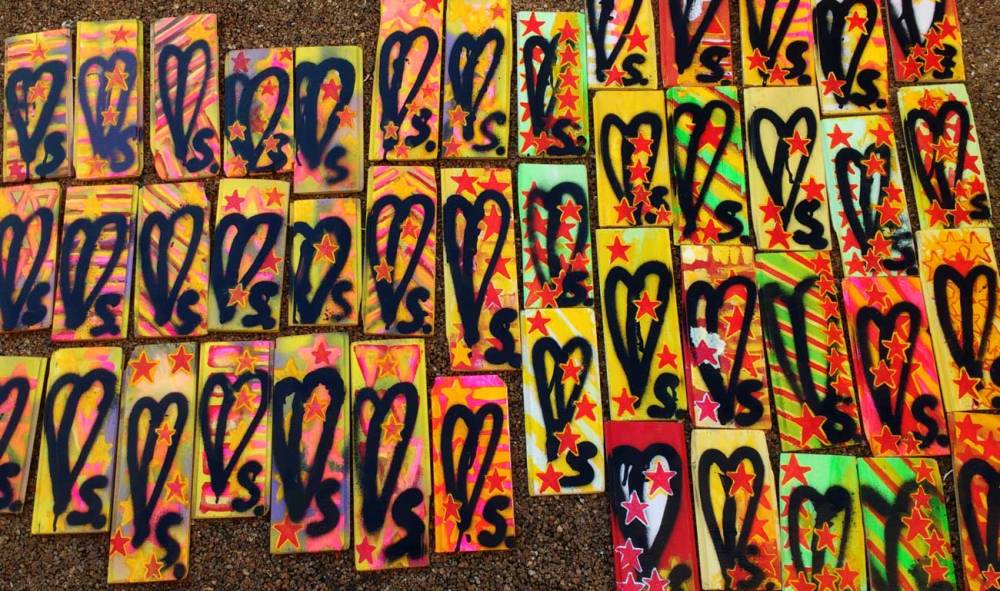 25: SEAN WORRALL – Leaves – Acrylic, sprat paint on round recycled wood, art drop pieces ready to be left on out on the street (2018)