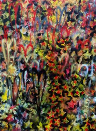 27:SEAN WORRALL – Found it at The Welfare Store (2018) – Acrylic, spray paint, brushwork, gloss varnish on found canvas (125cm x 90cm).