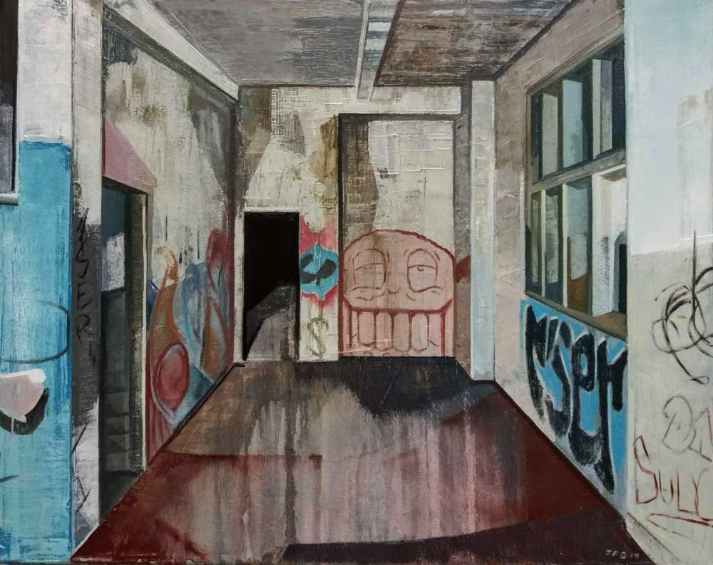 5: BEN FENTON – I WAS ONLY A FISHING SMACK (THE OBSERVER BUILDING), 2019 Oil on canvas, 50cm x 70cm