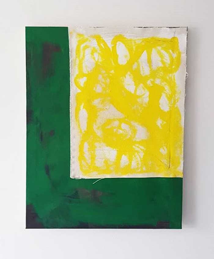 65: AMANDA CHILDS – Canola (2020). Acrylic, charcoal pencil & collaged canvas on canvas