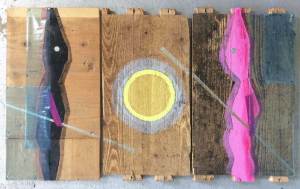 74: GLISKA – The People Yet To Come, triptychon, 32x60cm + 30x60cm + 35x60cm, acrylic on wood panel (partly re-used), tape, packaging film, 2019