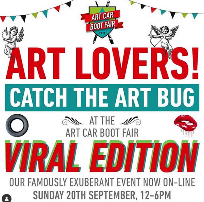 The Art Car Boot Fair happens on line this year then, it happens this Sunday September 20th, if we understand things right Art Car Boot Fair members get priority entry to this (and all other events during a twelve month period), member are allowed in first for a first pick of the art at midday, a £5 day pass gets you in a 2.30pm and we’re told that from 5.30pm until 6.30pm you can get in for free, membership details and everything else can be found on the official website. We;re told to expect all kinds of things –