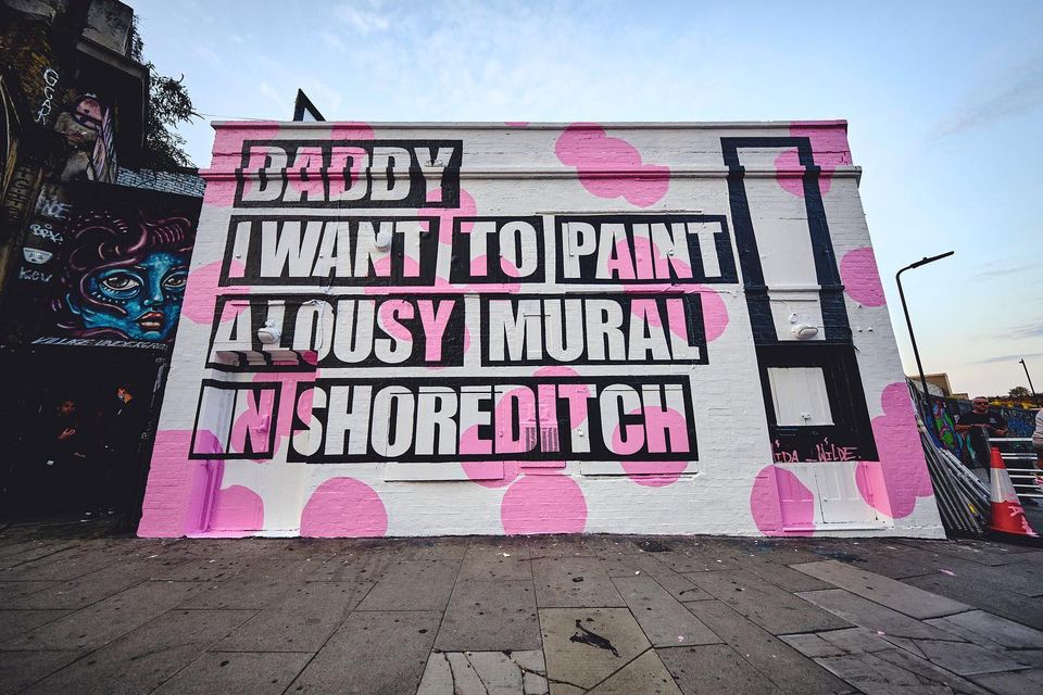 It did seem like there was maybe some kind of need to add a little more coverage in terms of the current London Mural Festival after the post on these fractured pages the other day, there was an opportunity to watch three white middle age blokes paint three pieces on the front of the building here in Hackney the other day as part of said festival, two rather unexciting pieces of who knows what or why and one piece, a Jimmy C piece, that did at least make some attempt to connect with the Hackney community and show some awareness of where he was actually painting. Elsewhere there are pieces imposed that mostly seem to tie in with a new gallery exhibition or a new print release, “come see my new mural, you find it a short work away from the gallery where I have a new show on right now” read one of several press release invites a few days back. . Is there a need to write something more about the festival or shall we just post this (stolen) photo of Aida Wilde’s latest rather inspired Shoreditch piece, an excellence slice of commentary…