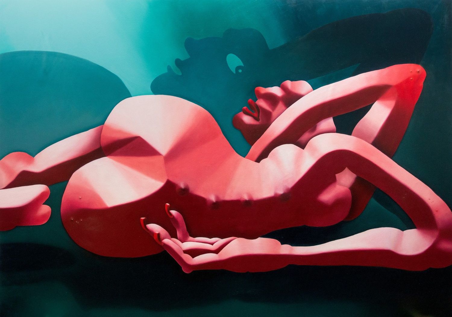 Faulkner’s painstakingly-thorough method of representation locks our attention down to the subject. He is clear-eyed in showing us a scenario. However, some new paintings show an interesting development in technique, a departure from the clearly-articulated realism that is his familiar signature. He deploys a softer, more diffuse, application of waxy paint. Contours and outlines are blurred and heightened, colour shimmers and pulses. The pictures take on an ethereal quality, fading or un-focussing before our eyes and a shifting uncertainty of perception enters the stage. In one painting he looks out at us, full face at last, his features lit by a fierce red glow, a moment of sudden un-masking.
