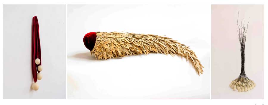 A startling new wall sculpture in the exhibition is inspired by Gathering, a significant public commission at Tatton Park Mansion in 2019, which showed a voluptuous piece combining red velvet elements and barbed wire pieces cascaded into the staircase hall. The work is inspired not only by the history and architecture of Tatton Park, but also the story of a wild costume ball held there in 1897, in which the hostess wore red velvet.