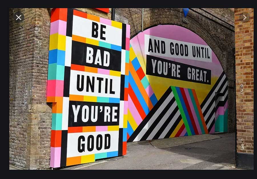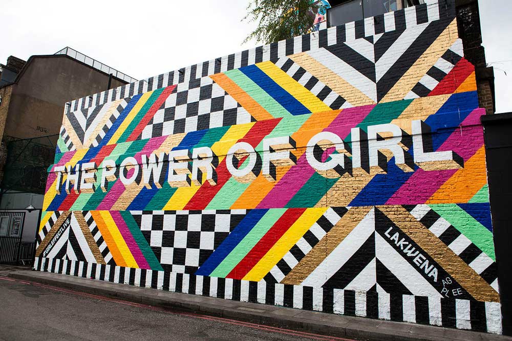 Lakwena Maciver “is a London-based artist, born in London in 1986, with mixed Ugandan and British heritage. Best known for her murals painted internationally, she has shown work in cities including London, Miami, Los Angeles, Las Vegas, New York and Vienna, both within the gallery and in the public realm. Her work, primarily text-based, employs a combination of words, pattern and acid-bright colour to subtly subvert prevailing mythologies. Her use of text and image re-appropriates the powerful and monumental visual language and lyrical mythologising of commercial advertising billboards and is informed by decoration both aesthetically and conceptually. Interested in the role of the artist as mythmaker, Lakwena explores how this translates into contemporary popular culture. Concerned with the significance of how and who we decorate, and what this reflects about our values and beliefs, Lakwena positions kaleidoscopic colours, bold pattern and adornment as powerful signifiers to redefine and reassign value and glory”.